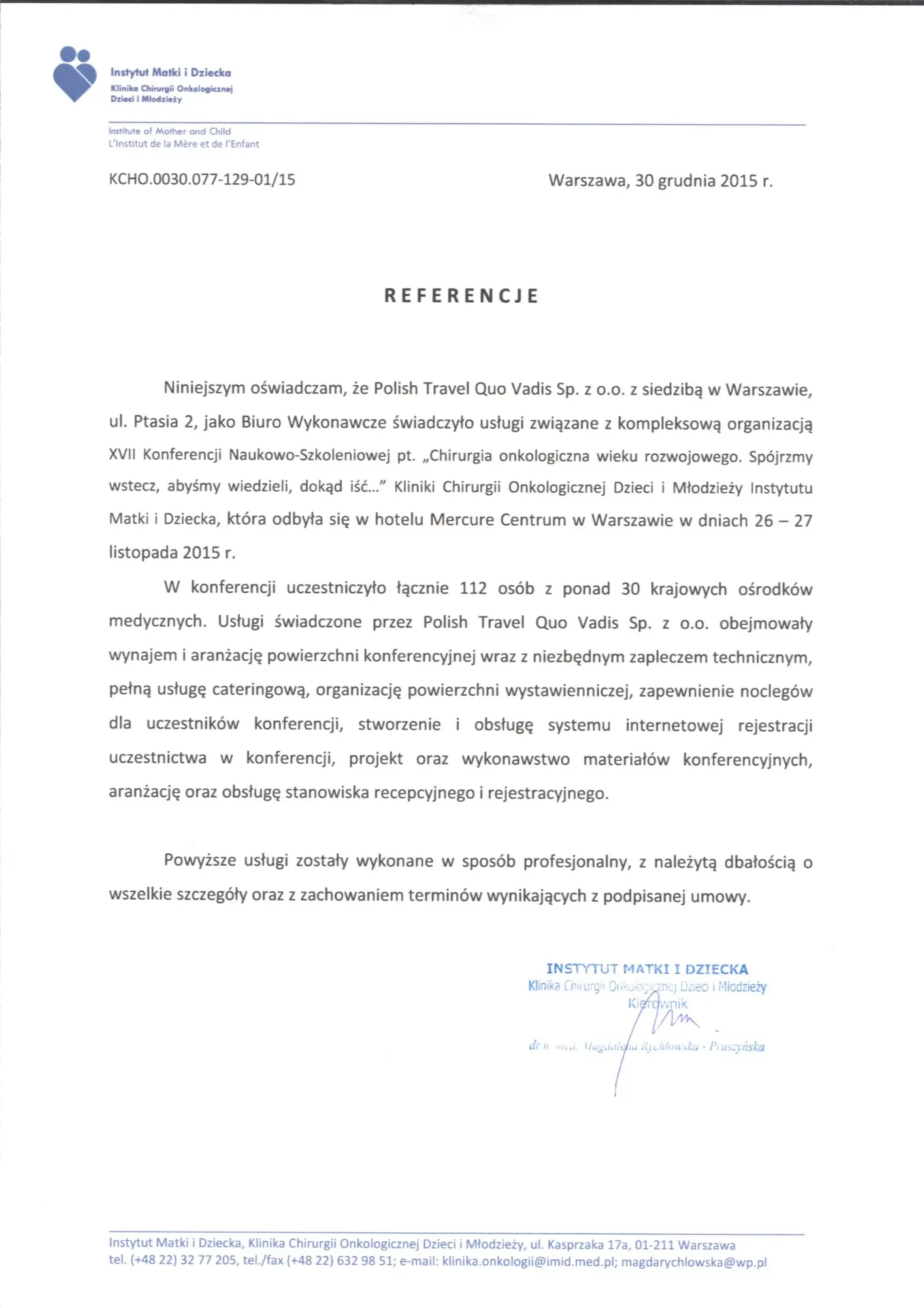 W konferencji uczestniczyło łącznie 112 osób z ponad 30 krajowych ośrodków medycznych. Usługi świadczone przez Polish Travel Quo Vadis Sp. z o.o. obejmowały wynajem i aranżację powierzchni konferencyjnej wraz z niezbędnym zapleczem technicznym, pełną usługę cateringową, organizację powierzchni wystawienniczej, zapewnienie noclegów dla uczestników konferencji, stworzenie i obsługę systemu internetowej rejestracji uczestnictwa w konferencji, projekt oraz wykonawstwo materiałów konferencyjnych, aranżację oraz obsługę stanowiska recepcyjnego i rejestracyjnego.